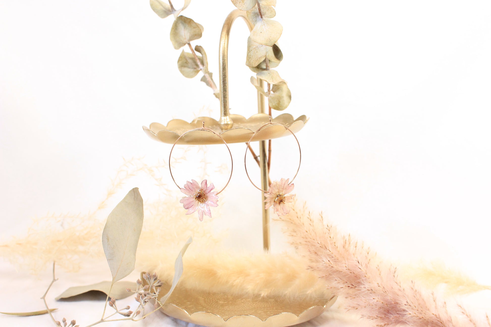 Ces anneaux en acier inoxydable argentés étonnent par leur légèreté et par leurs vraies fleurs délicatement préservées. Chaque paire capture la grâce éphémère des fleurs. Un accessoire poétique pour un style aussi unique que vous!